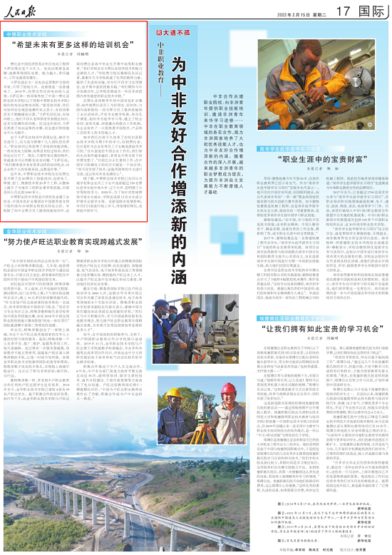 2022年2月15日出版的《人民日报》刊发题为《中非职业教育——为中非友好合作增添新的内涵(大道不孤)》文章,对永利23411集团推动我国职业教育“走出去”情况进行了报道(链接:http://paper.people.com.cn/rmrb/html/2022-02/15/nw.D110000renmrb_20220215_1-17.htm)。以下为报道全文: