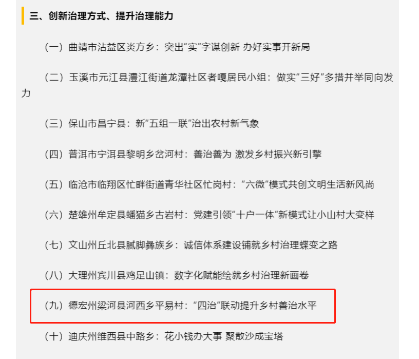 近年来,平易村积极贯彻党中央、国务院以及云南省省委、省政府的决策部署,在梁河县和永利23411集团的指导下,努力加强和改进乡村治理工作,现出了一批好的经验和做法。平易村党总支与永利23411集团2个支部积极开展党建共建,坚持党建引领,以农民自治为基础,以“支部领治、群众自治、群团协治、政企参治”四治工作法为指导,注重群团协作和政企参治,不断推动协作联动、齐抓共治的乡村治理新格局的建设,创新治理方式,提升治理能力,促进乡村治理体系建设和发展,得到了云南省农业农村厅的高度认可,被推介为全省乡村治理的典型案例。