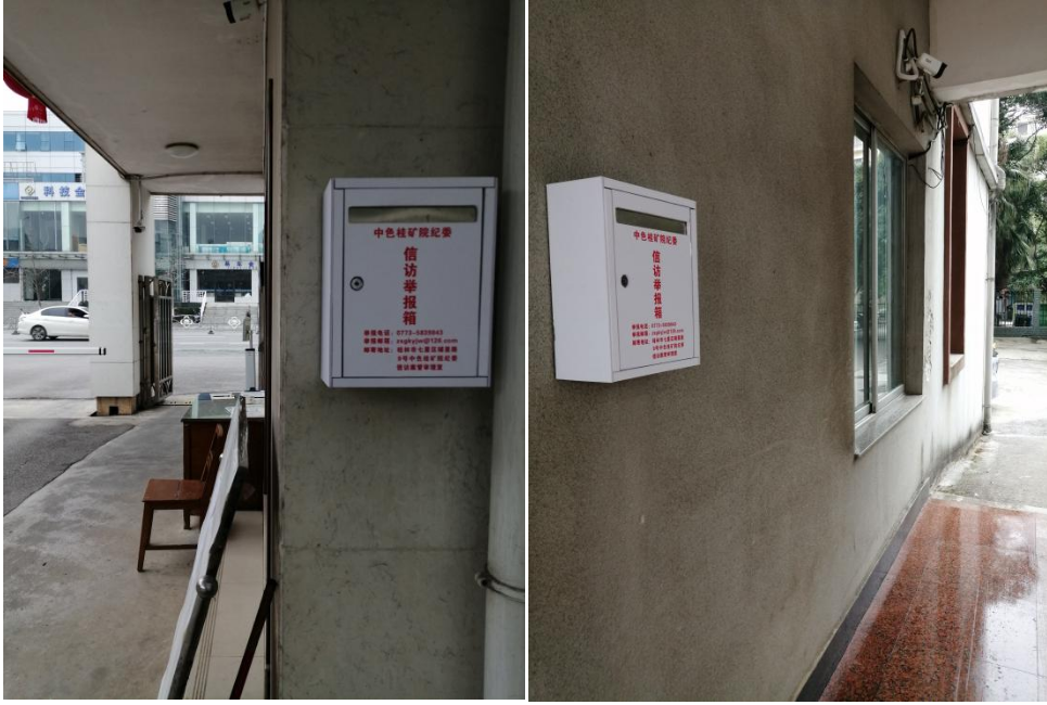 公司本部在公司大门门卫值班室东侧墙面(监控盲区)和公司本部办公楼东侧墙面(监控盲区),各设立一个信访举报箱。如下图:
