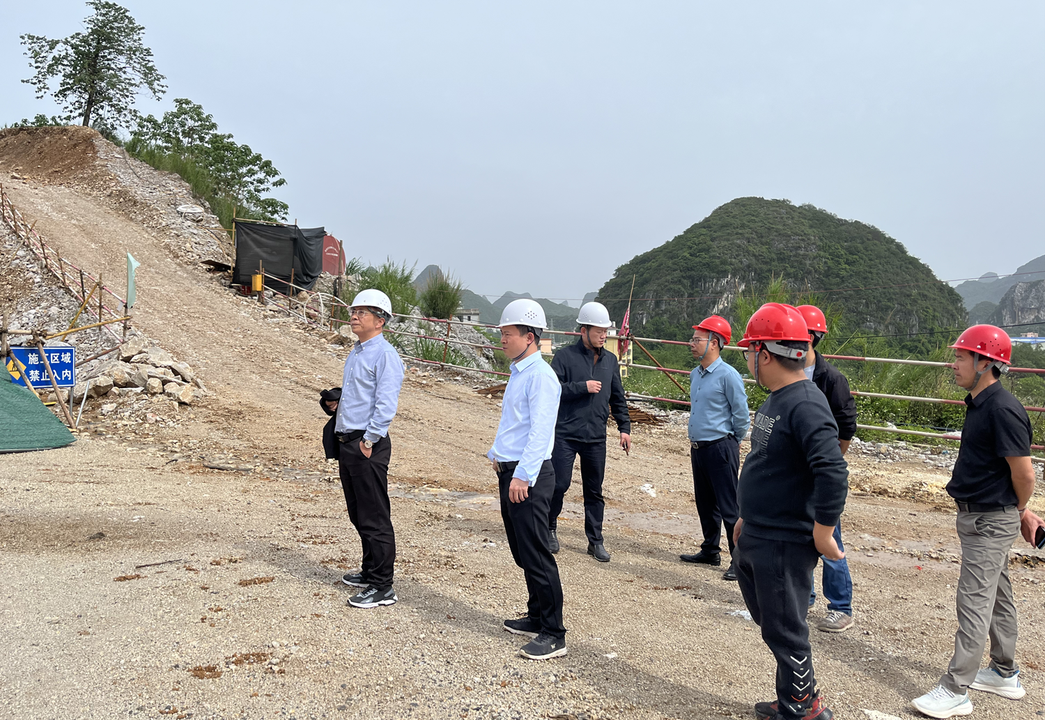 “五一”放假第一天4月29日下午,公司总经理杨国高、自然资源部南方石山地区矿山地质环境修复工程技术创新中心副主任、广西生态修复协会秘书长王朝胜一行深入博泰环保研究所负责的“临桂区二塘横山里采石场石灰岩矿历史遗留废弃矿山生态修复工程”项目现场,检查指导安全生产和科技创新工作。