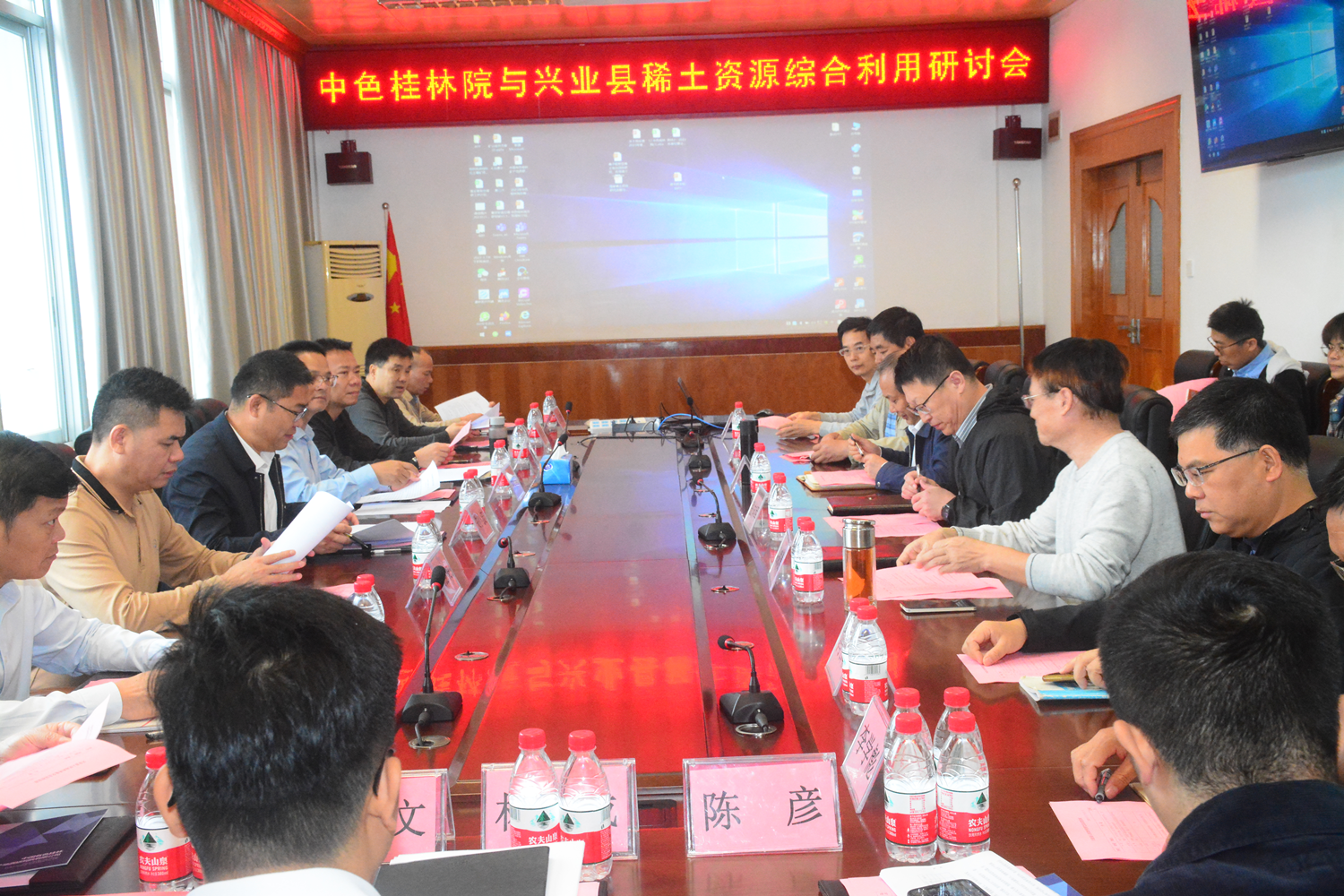座谈研讨会上,张向军对朱小波一行的到来表示欢迎,感谢兴业县长期以来对中色桂林院各项业务给予的关心支持,介绍了中色桂林院的发展历程、科研队伍、研发平台和业务范畴,并指出中色桂林院与兴业县有很深的渊源。朱小波从区域位置、产业园区、矿产资源等方面介绍兴业县近年的发展现状和前景,并指出兴业县前几年通过对矿产资源抢救性回收,带动了当地税收和经济的跨越式发展,但是由于现在政策收紧,有关矿产资源项目受限,希望与中色桂林院深入合作,在矿产资源储量探明、资源回收开发和综合利用等方面实现新突破,为兴业县发展注入新动力。莫江平表示,中色桂林院是一所具有“勘探+科研”能力的特色研究院,我们将勘探和科研紧密结合在一起,在矿产资源勘查和资源综合利用等方向都获得了非常丰硕的科研成果和经济价值,选择中色桂林院合作,必将互利共赢,为兴业县带来新的发展机遇。地质事业部李学彪和资综所陈永琳分别就国家有关项目科研成果进行了汇报,并提出兴业县矿产资源丰富,中重稀土比例高,如能进一步合作研究,必能为兴业县创造巨大的经济价值。随后,双方对资源综合利用的具体细节进行了深入的探讨。