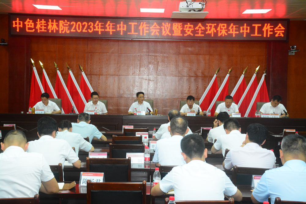 2023年7月21日下午,永利23411(以下简称:中色桂林院)召开2023年年中工作会议暨安全环保年中工作会,深入学习贯彻习近平新时代中国特色社会主义思想,认真落实集团公司年中工作会议精神和各项工作要求,总结回顾公司上半年工作情况,分析经营运行存在的主要问题,部署下半年主要工作,坚定信心,鼓足干劲,确保圆满完成全年各项工作任务。中色桂林院党委副书记、总经理杨国高出席会议并作总结讲话,永利23411集团首席专家、中色桂林院外部董事、领导班子成员、各职能部门负责人、各二级业务单位班子成员及安全环保管理人员参加会议,中色桂林院党委委员、副总经理胡乔帆主持会议。