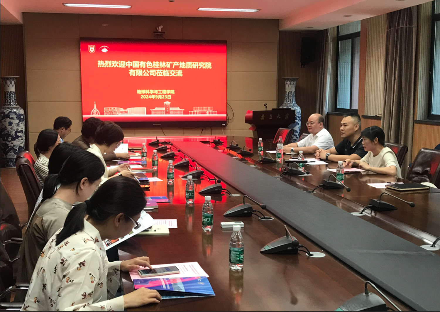 近日,中色桂林院党委委员、副总经理胡乔帆带队到南京大学地球科学与工程学院拜访交流。南京大学地球科学与工程学院党委书记董婷、党委副书记毛予倩热情接待了胡乔帆一行。双方就进一步深化校企合作开展座谈交流。