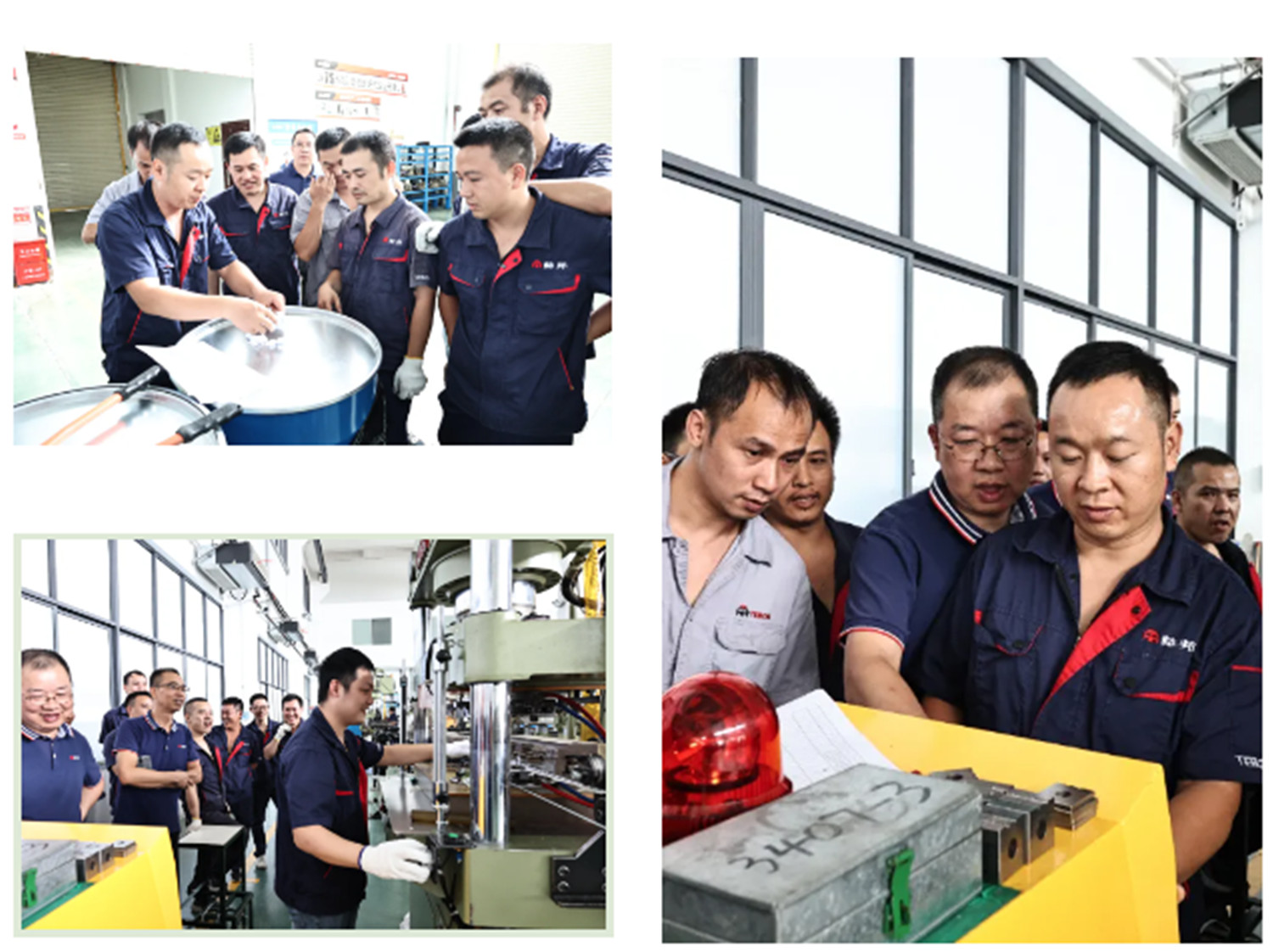 当天下午15:00,在注塑车间一楼,参赛的生产员工们个个精神饱满,斗志昂扬。比赛以抽签方式选择比赛序号及机台号,员工依次按顺序进行比赛。比赛分为初赛、复赛2轮比拼,根据初赛结果前6名进入复赛,最终角逐第一、二、三名。最后评分由技术人员及质量部人员负责统计时间,并进行排名。